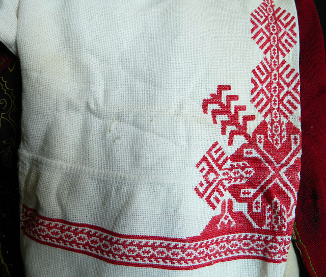 This one is from Barta region - black skirt with the red line at the bottom, red bodice and white shirt with black embroidery. It has been well worn and some things are missing - for example, the silver brocade ribbons which decorated the bodice, but otherwise all in all in good condition.